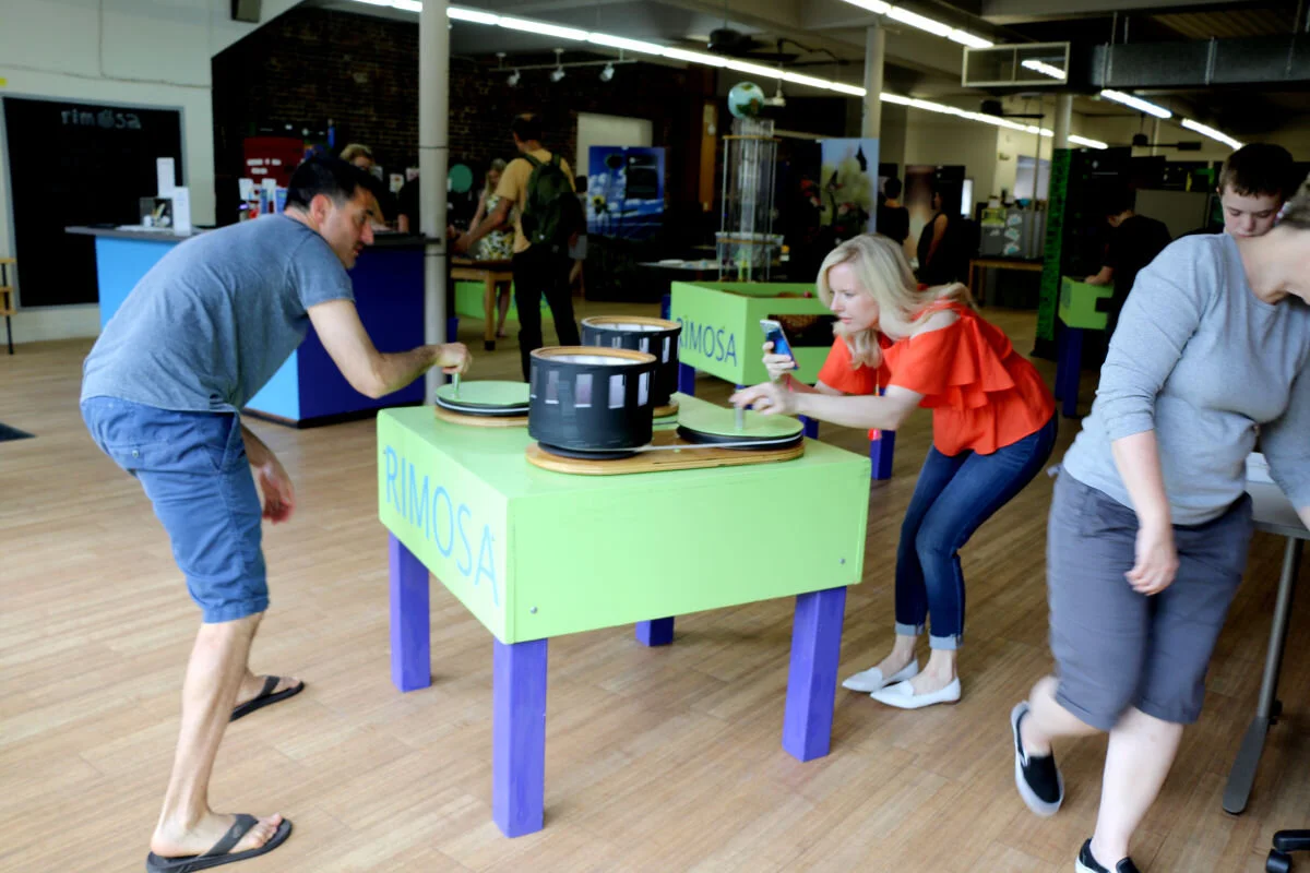 To make the exhibit hands-on... pumps are wide and long, encouraging users to jump/step on them, the spinning disc can spin freely but securely under various forces, and the plastic bags offer a unique tangible experience inflated or deflated